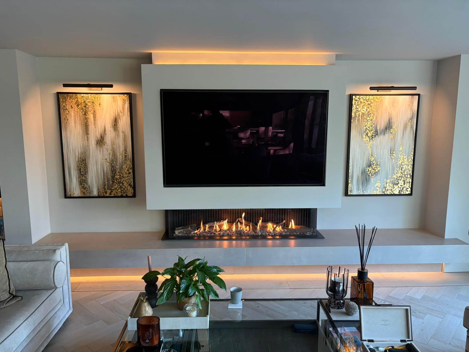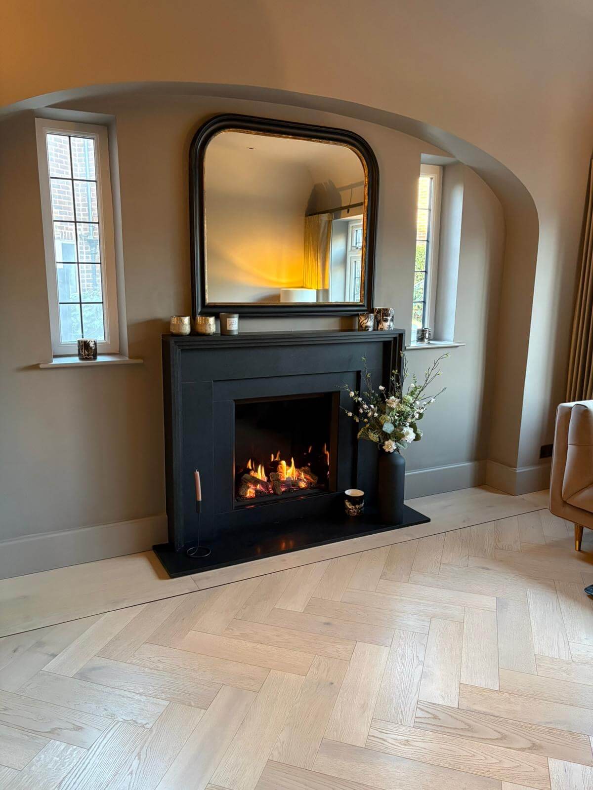 As part of a full home refurbishment, we delivered several fireplace installations throughout this Manchester property. The project included Kalfire gas fires in key living spaces, a Gazco fire in the study, and a striking room divider fire in the newly converted basement. The basement was transformed into a standout entertaining space, complete with a bar and gym, with the fire acting as a central feature. We also installed a wood-burning stove in the client’s outdoor office, creating a warm, usable space year-round.